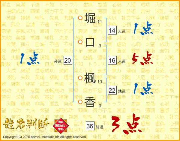 堀(11画)口(3画) 楓(13画)香(9画)