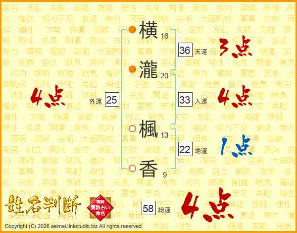 横(16画)瀧(20画) 楓(13画)香(9画)