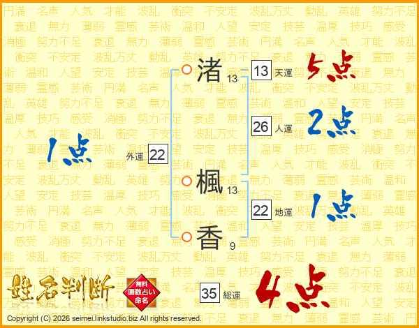 生活面を象徴する運勢です。外部から受ける影響力を表し、結婚運、家庭運や職場、環境への順応性を表します。総運から人運を引いた画数。姓や名が1文字の場合を除く。