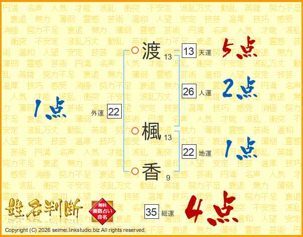 渡(13画) 楓(13画)香(9画)