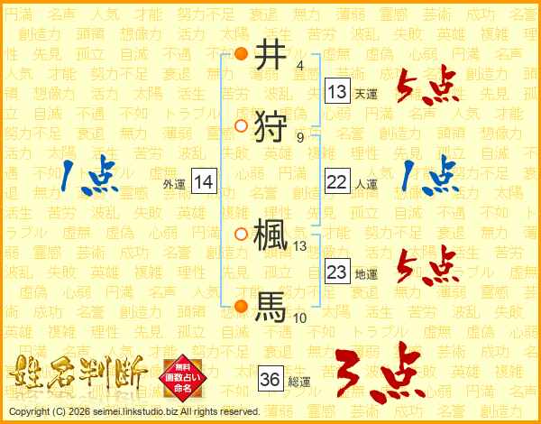 井(4画)狩(9画) 楓(13画)馬(10画)