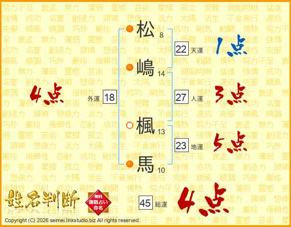 松嶋楓馬さんの総運は45画の4点!