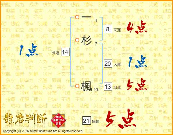 生活面を象徴する運勢です。外部から受ける影響力を表し、結婚運、家庭運や職場、環境への順応性を表します。総運から人運を引いた画数。姓や名が1文字の場合を除く。