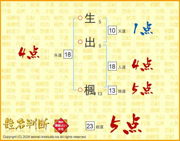 生出楓さんの総運は23画の5点!