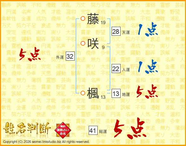 藤(19画)咲(9画) 楓(13画)