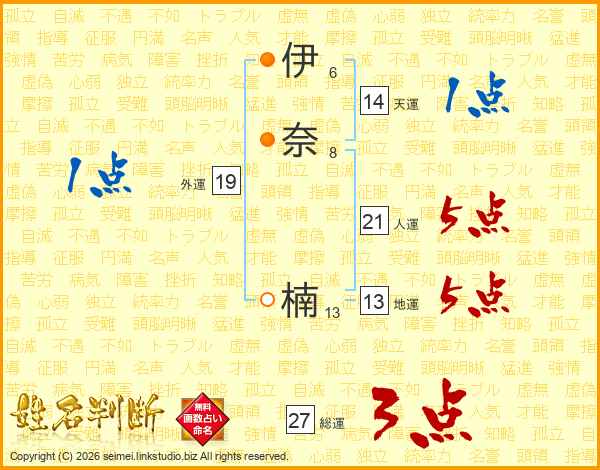 伊(6画)奈(8画) 楠(13画)