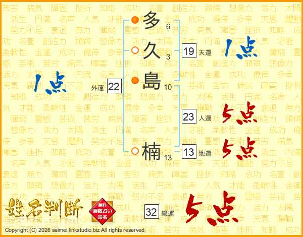 生活面を象徴する運勢です。外部から受ける影響力を表し、結婚運、家庭運や職場、環境への順応性を表します。総運から人運を引いた画数。姓や名が1文字の場合を除く。