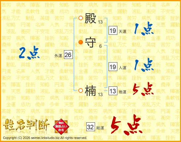 殿(13画)守(6画) 楠(13画)