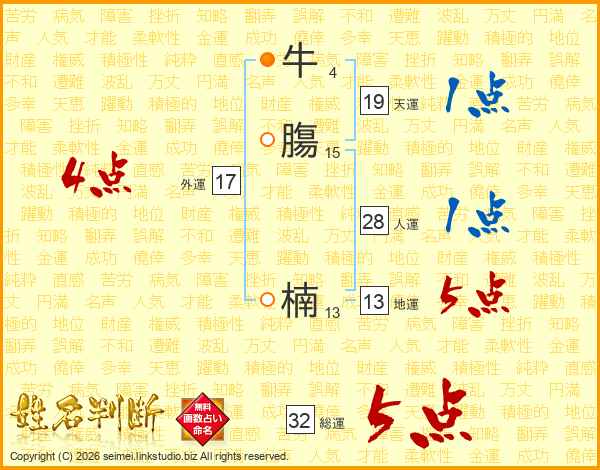 生活面を象徴する運勢です。外部から受ける影響力を表し、結婚運、家庭運や職場、環境への順応性を表します。総運から人運を引いた画数。姓や名が1文字の場合を除く。