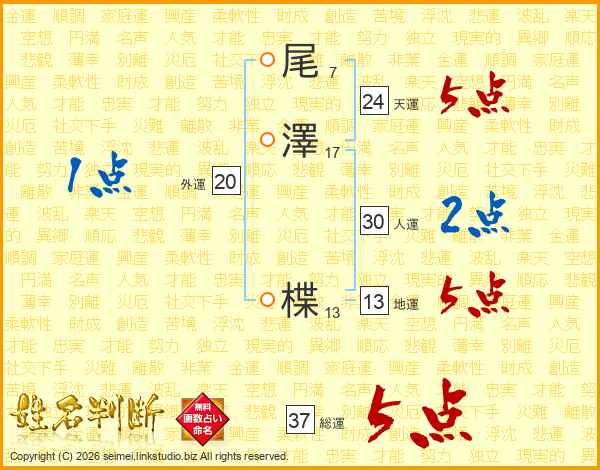 尾澤楪さんの総運は37画の5点!