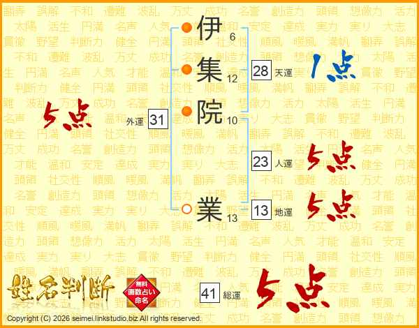 あなたの人生を表す1番重要な運勢です。生涯を通じて影響する総合運となり、主に50歳以降の晩年期に影響を及ぼします。苗字と名前の合計画数。