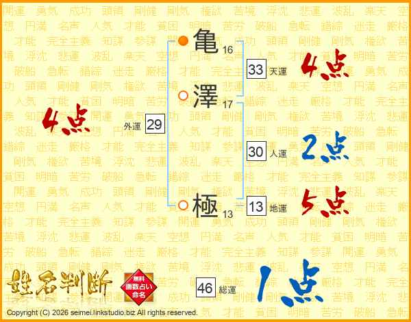 あなたの人生を表す1番重要な運勢です。生涯を通じて影響する総合運となり、主に50歳以降の晩年期に影響を及ぼします。苗字と名前の合計画数。