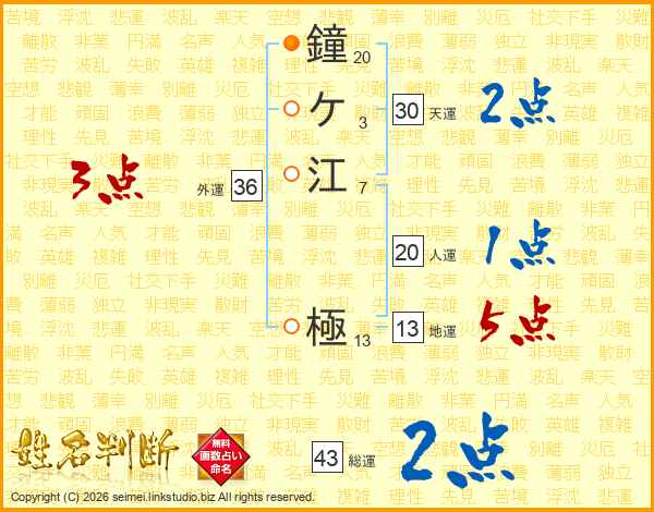 鐘(20画)ケ(3画)江(7画) 極(13画)