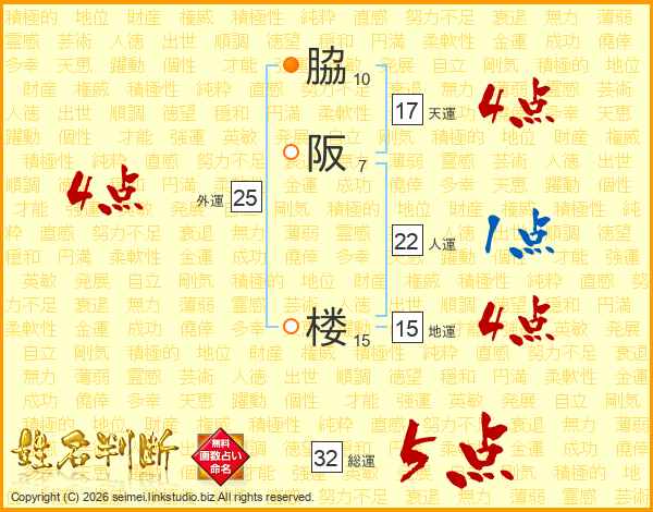 生活面を象徴する運勢です。外部から受ける影響力を表し、結婚運、家庭運や職場、環境への順応性を表します。総運から人運を引いた画数。姓や名が1文字の場合を除く。