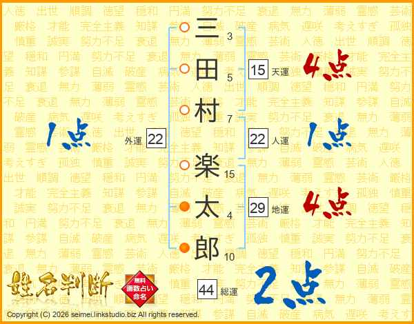 三(3画)田(5画)村(7画) 楽(15画)太(4画)郎(10画)
