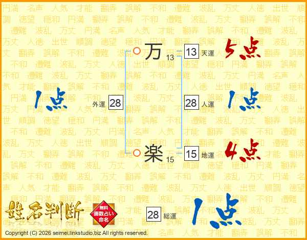 生活面を象徴する運勢です。外部から受ける影響力を表し、結婚運、家庭運や職場、環境への順応性を表します。総運から人運を引いた画数。姓や名が1文字の場合を除く。