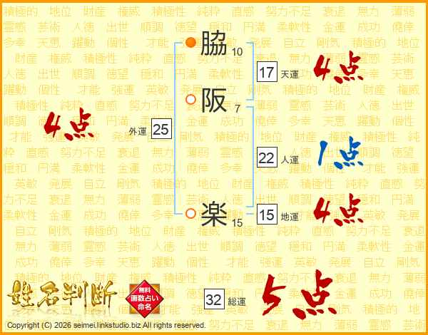 脇阪楽さんの総運は32画の5点!