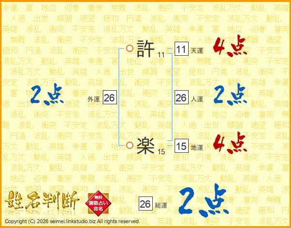 生活面を象徴する運勢です。外部から受ける影響力を表し、結婚運、家庭運や職場、環境への順応性を表します。総運から人運を引いた画数。姓や名が1文字の場合を除く。