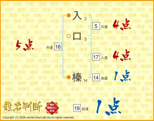 生活面を象徴する運勢です。外部から受ける影響力を表し、結婚運、家庭運や職場、環境への順応性を表します。総運から人運を引いた画数。姓や名が1文字の場合を除く。