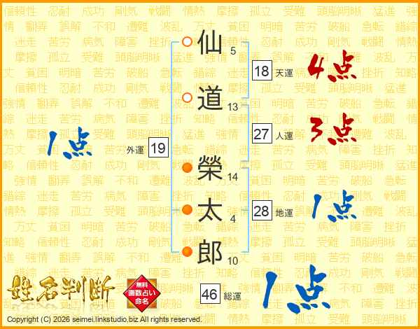 仙(5画)道(13画) 榮(14画)太(4画)郎(10画)