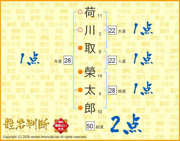荷(11画)川(3画)取(8画) 榮(14画)太(4画)郎(10画)