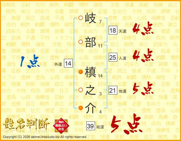 岐(7画)部(11画) 槙(14画)之(3画)介(4画)