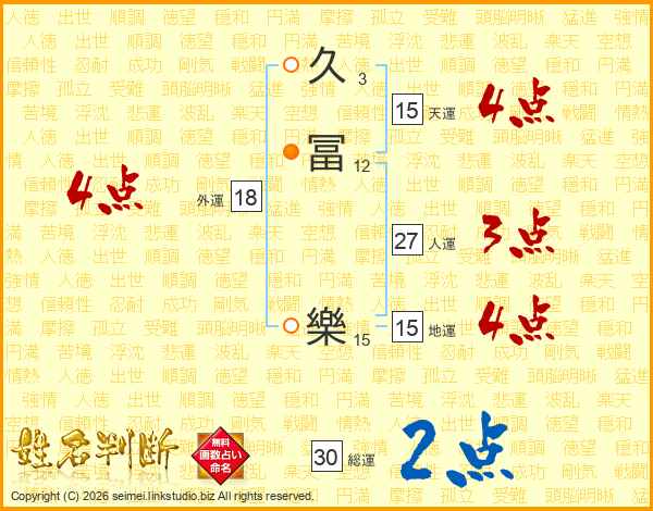 あなたの人生を表す1番重要な運勢です。生涯を通じて影響する総合運となり、主に50歳以降の晩年期に影響を及ぼします。苗字と名前の合計画数。
