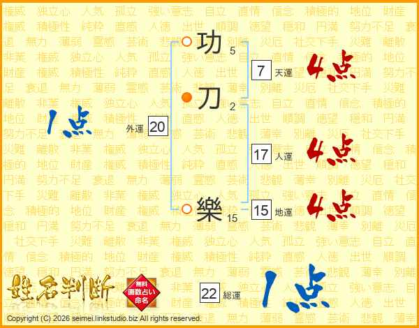 生活面を象徴する運勢です。外部から受ける影響力を表し、結婚運、家庭運や職場、環境への順応性を表します。総運から人運を引いた画数。姓や名が1文字の場合を除く。