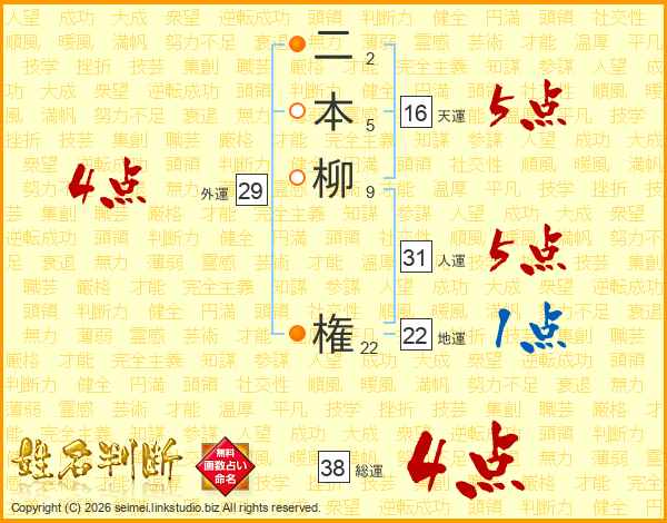 二本柳権さんの総運は38画の4点!