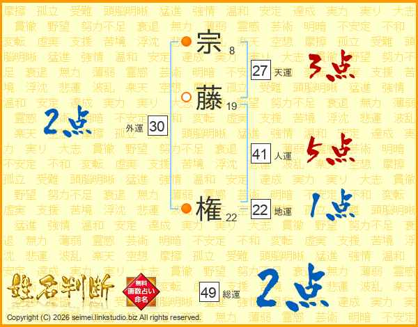 あなたの人生を表す1番重要な運勢です。生涯を通じて影響する総合運となり、主に50歳以降の晩年期に影響を及ぼします。苗字と名前の合計画数。