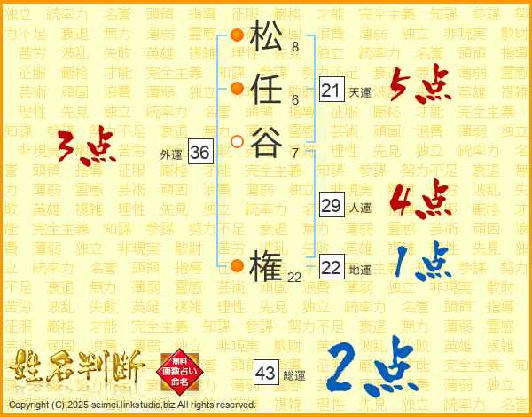 あなたの人生を表す1番重要な運勢です。生涯を通じて影響する総合運となり、主に50歳以降の晩年期に影響を及ぼします。苗字と名前の合計画数。