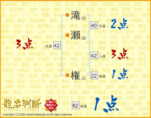 生活面を象徴する運勢です。外部から受ける影響力を表し、結婚運、家庭運や職場、環境への順応性を表します。総運から人運を引いた画数。姓や名が1文字の場合を除く。