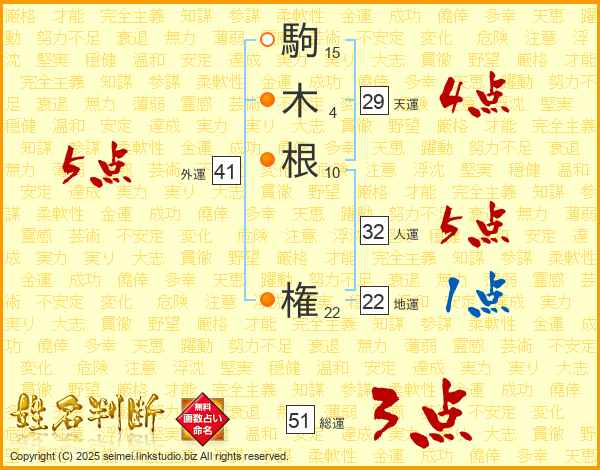 駒(15画)木(4画)根(10画) 権(22画)