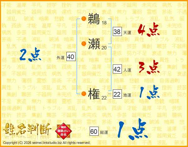 生活面を象徴する運勢です。外部から受ける影響力を表し、結婚運、家庭運や職場、環境への順応性を表します。総運から人運を引いた画数。姓や名が1文字の場合を除く。