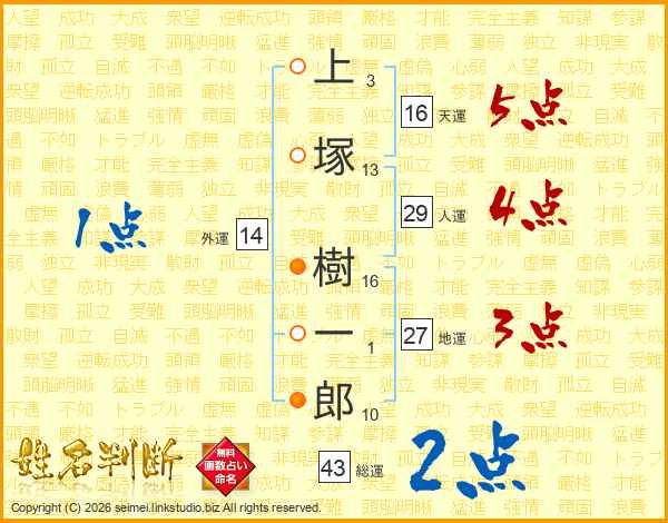 上(3画)塚(13画) 樹(16画)一(1画)郎(10画)