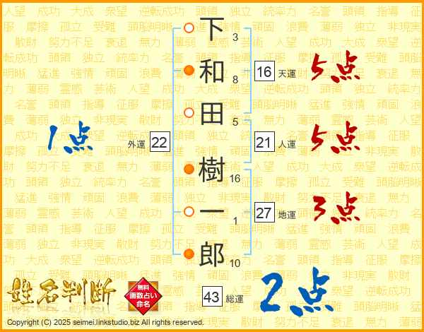 下(3画)和(8画)田(5画) 樹(16画)一(1画)郎(10画)