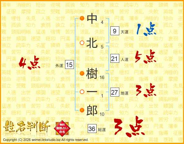 中(4画)北(5画) 樹(16画)一(1画)郎(10画)