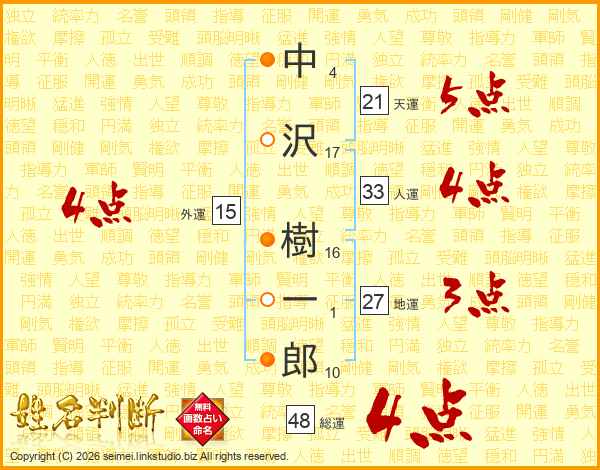 中(4画)沢(17画) 樹(16画)一(1画)郎(10画)