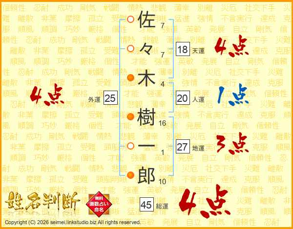 佐々木樹一郎さんの総運は45画の4点!