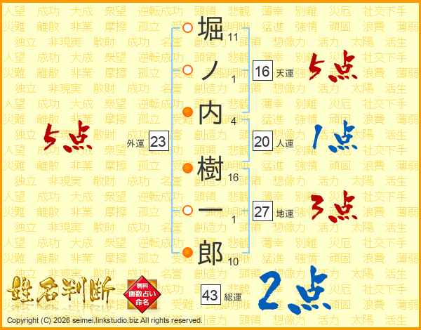 堀(11画)ノ(1画)内(4画) 樹(16画)一(1画)郎(10画)