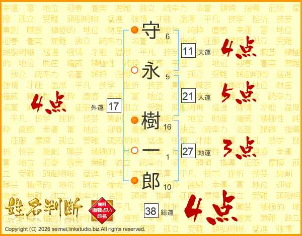 守(6画)永(5画) 樹(16画)一(1画)郎(10画)