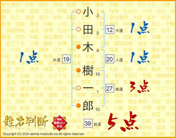 小(3画)田(5画)木(4画) 樹(16画)一(1画)郎(10画)