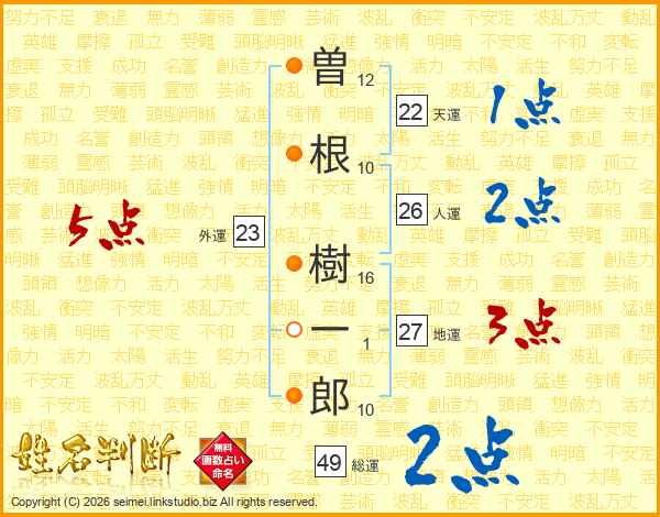 曽(12画)根(10画) 樹(16画)一(1画)郎(10画)