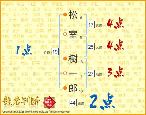松(8画)室(9画) 樹(16画)一(1画)郎(10画)