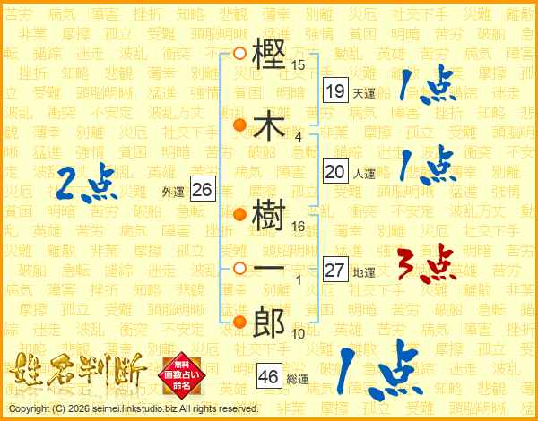 樫(15画)木(4画) 樹(16画)一(1画)郎(10画)