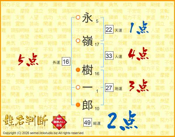 永(5画)嶺(17画) 樹(16画)一(1画)郎(10画)