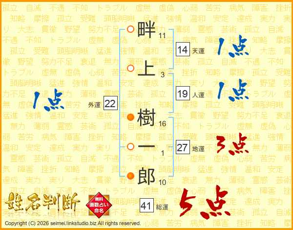 畔(11画)上(3画) 樹(16画)一(1画)郎(10画)