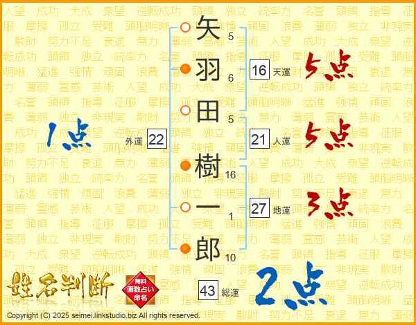 矢(5画)羽(6画)田(5画) 樹(16画)一(1画)郎(10画)