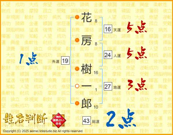 花(8画)房(8画) 樹(16画)一(1画)郎(10画)