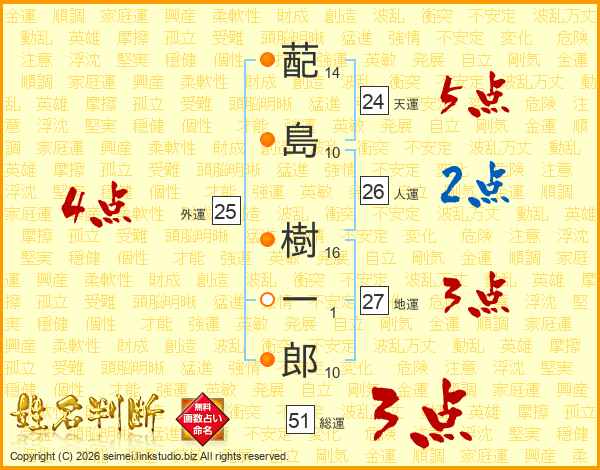 蓜(14画)島(10画) 樹(16画)一(1画)郎(10画)